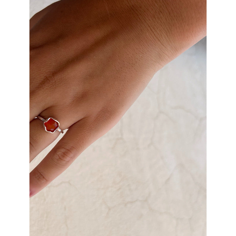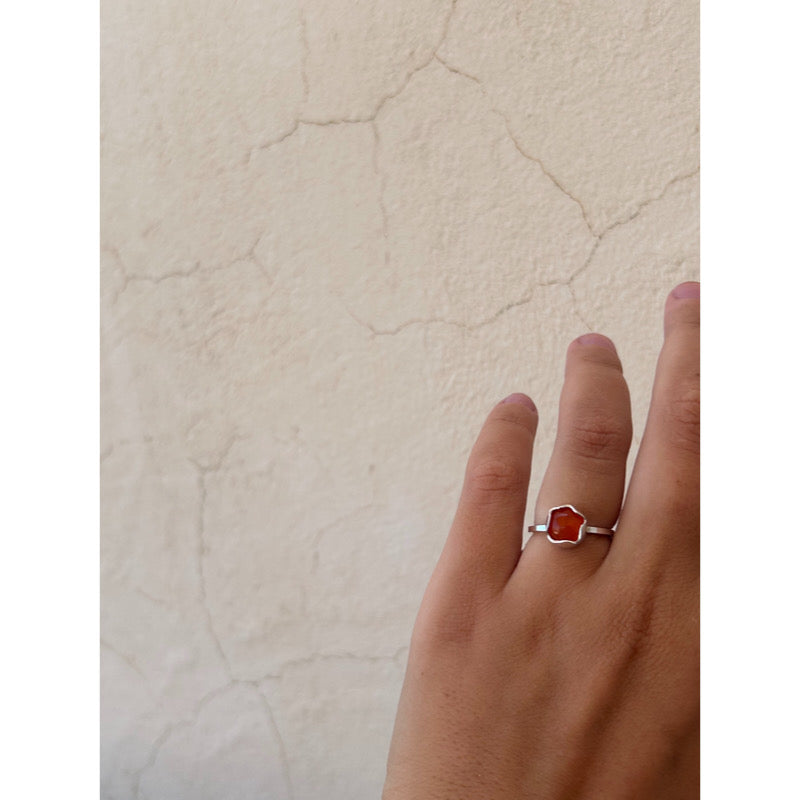 En vacker ring med en orange karneol, infattad i en mjuk och organisk form. Den naturliga designen ger ett levande och unikt uttryck.