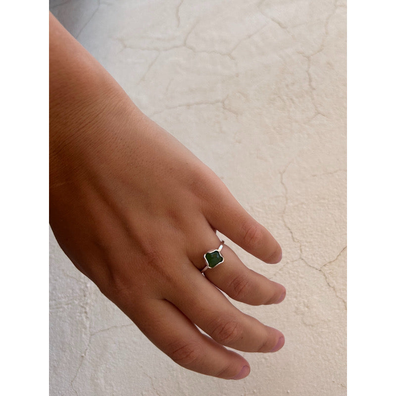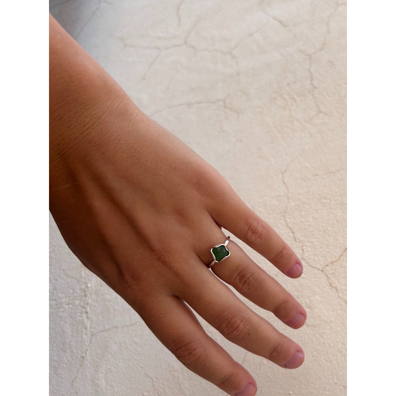 En vacker ring med en mörkgrön aventurin, infattad i en mjuk och organisk form. Den naturliga designen ger ett levande och unikt uttryck.